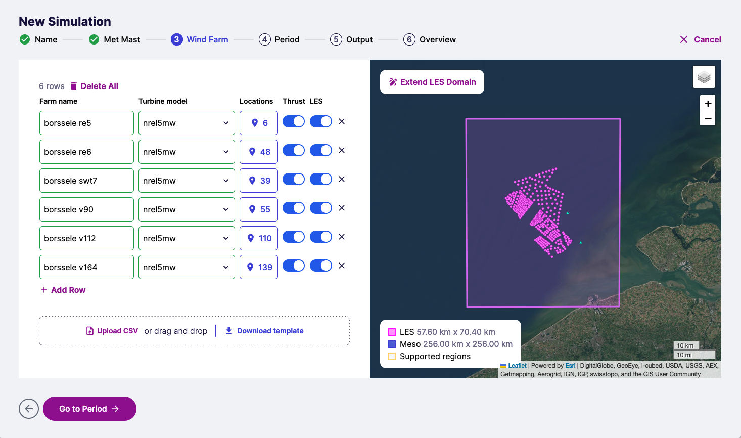 During the Wind farm step, you can add turbines to the simulation. This can be done either by manually filling out the form or by uploading a CSV file.