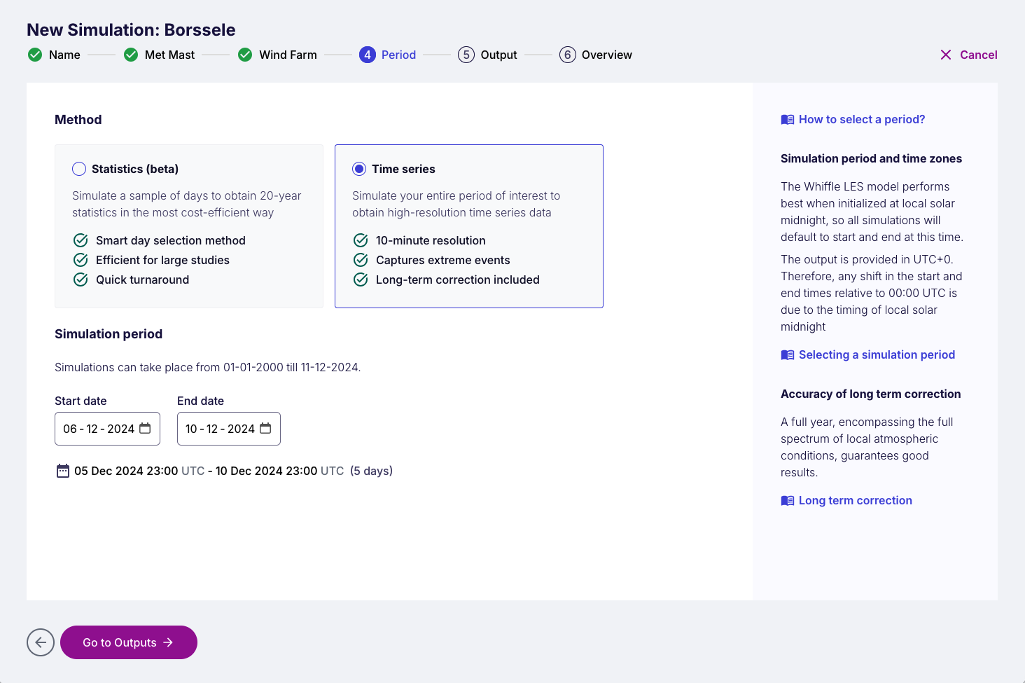 In the Period step select the Time series method. After selecting a Time Series run, you can specify the desired date range, from a minimum of 1 day to a maximum of 1 year.