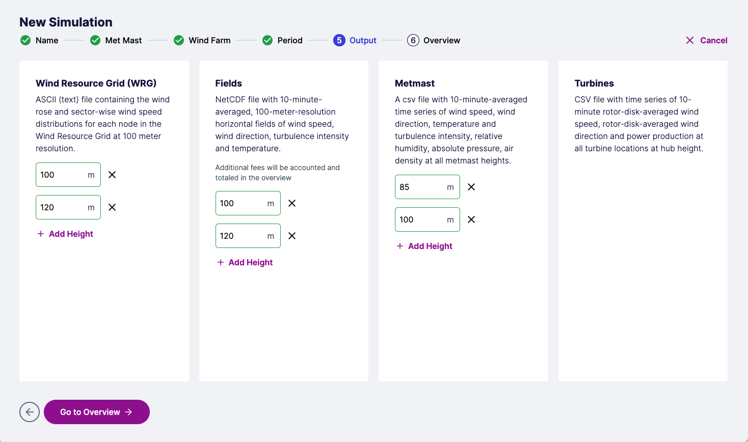 In the Output step, you can specify the heights for the output data. For more details about the output files and formats, refer to the [output overview](https://docs.whiffle.cloud/outputs/timeseries) for Time Series.